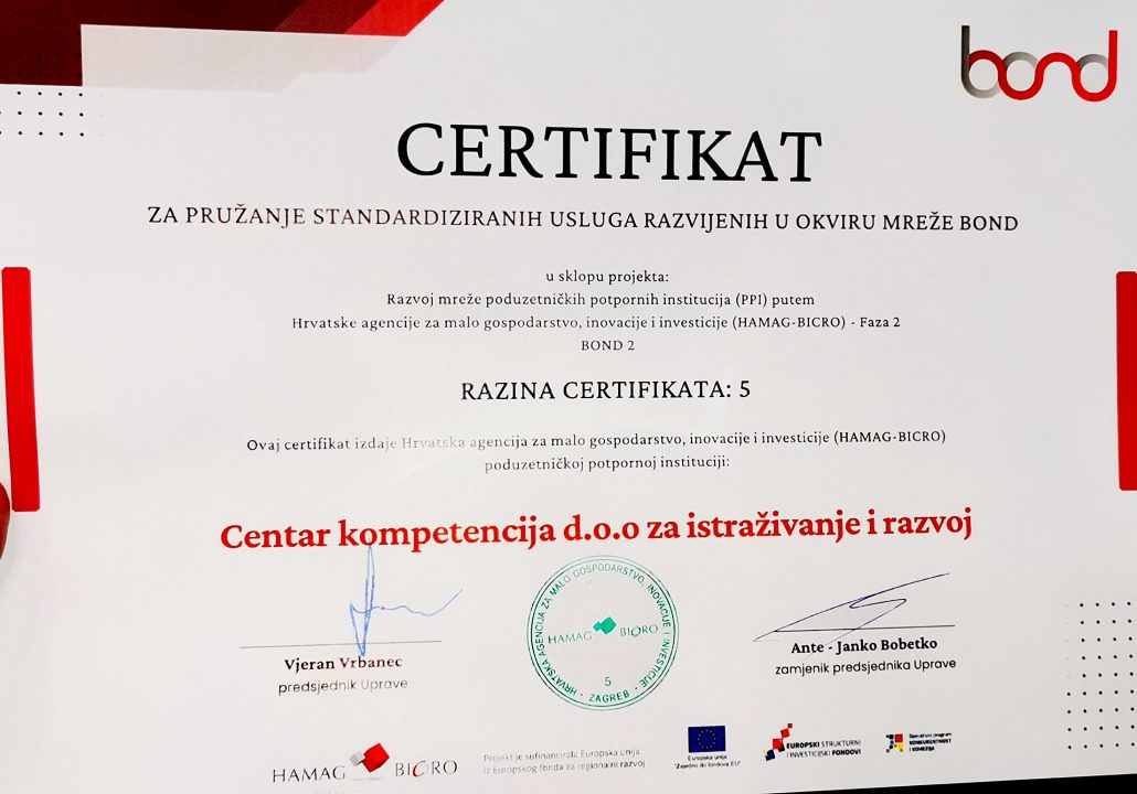 U Osijeku je održana Skupština Udruge BOND i Završna konferencija projekta BOND 2. Od ukupno 96 poduzetničkih potpornih institucija (PPI) koje su zadovoljite kriterije ulaska u mrežu BOND, kroz projekt su certificirane 42 poduzetničke potporne institucije, a certifikat najviše razine 5 dobilo je 13 PPI-jeva, među kojima i Centar kompetencija d.o.o. za istraživanje i razvoj.